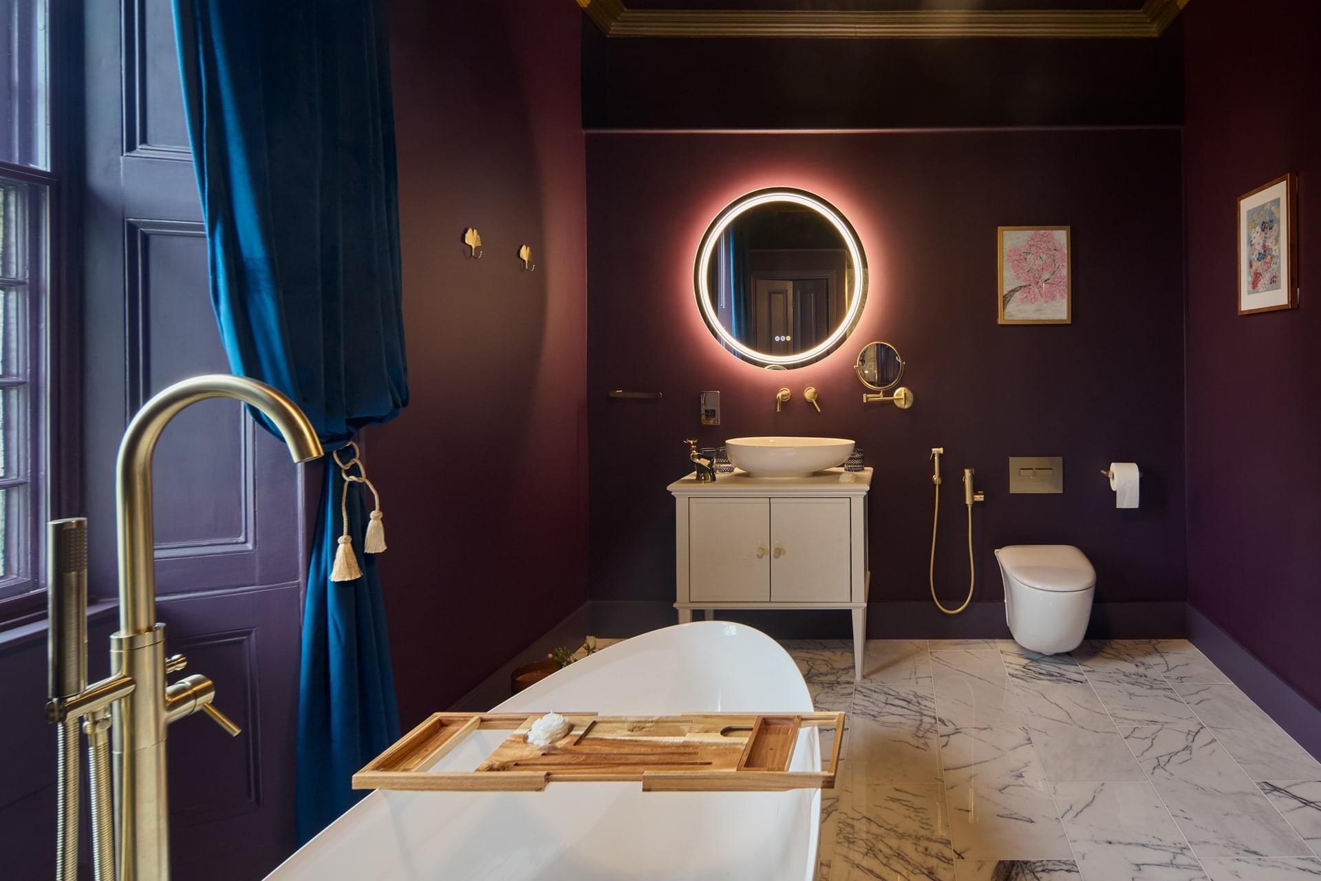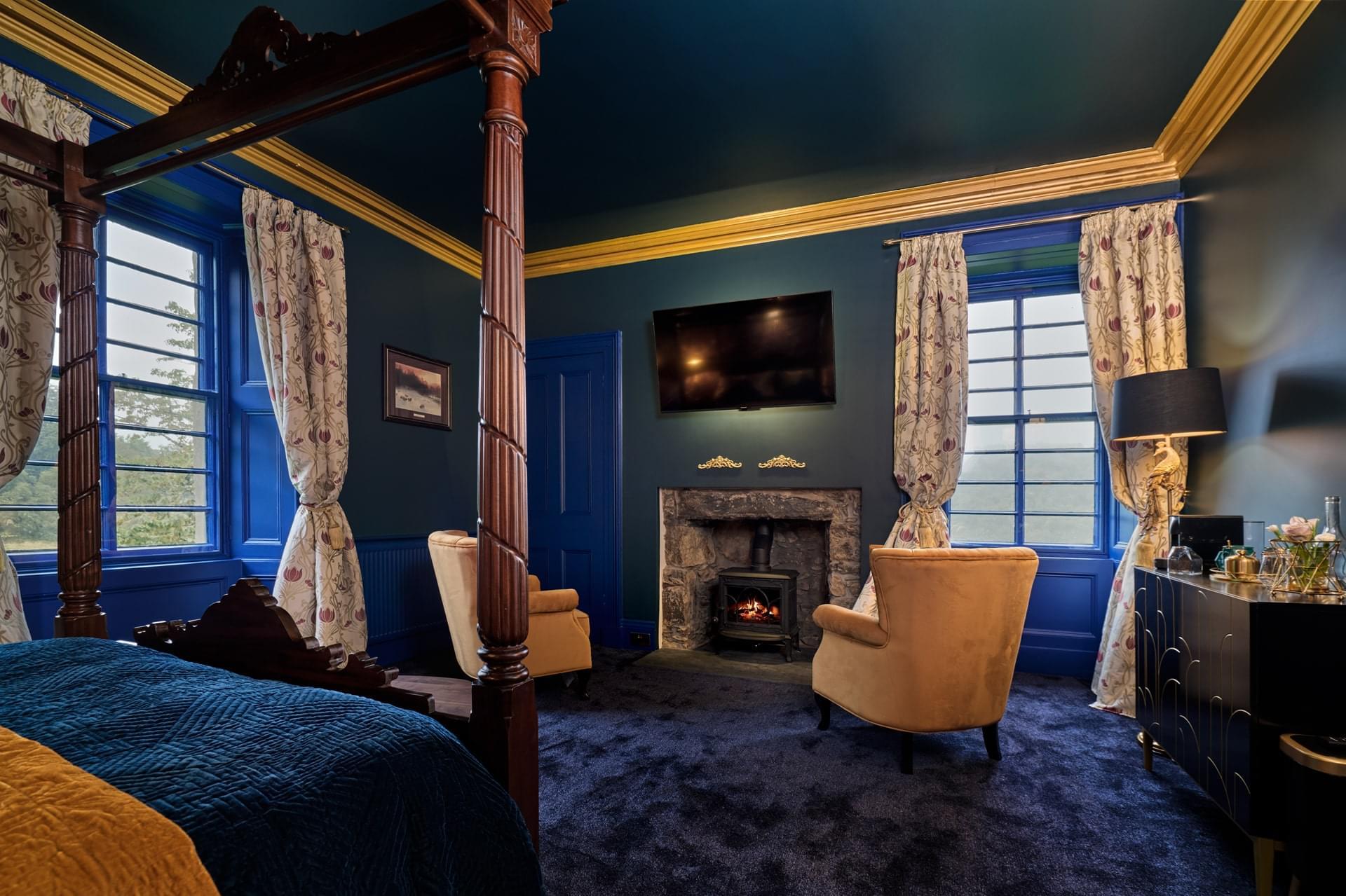Evoking the deep blues of the Scottish lochs, our Sapphire Bedroom offers commanding views to the south and west, taking in both of our gardens, the River Avon flowing in the strath below, and the Cromdale Hills beyond, allowing you to enjoy the mountain sunsets by the roaring fire of a Jøtul stove. The en-suite bathroom is tiled in marble and features a centrepiece bath, and a wet room area with a rainfall shower and body jets. Underfloor heating adds the extra touch of comfort even on the chilliest of mornings.